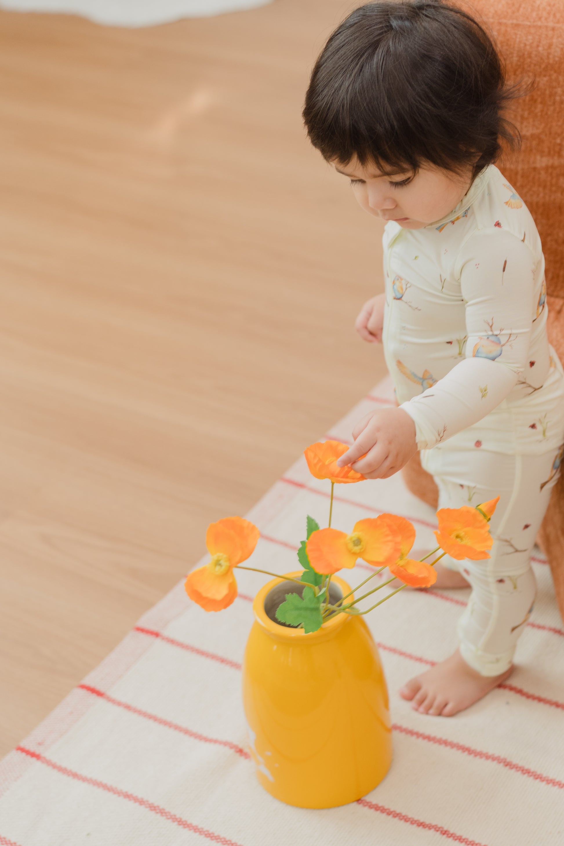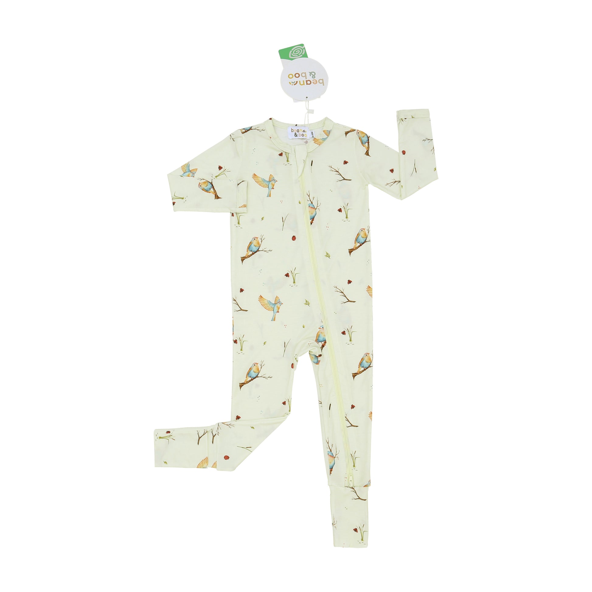 Let your little one flutter into a world of gentle wonder with our Featherwood print. Featuring sweet bluebirds in flight and at rest, playful ladybugs and soft watercolour branches, this hand painted illustration brings the calm of a storybook forest to life. Set against a soft, natural backdrop, this is a design that feels both dreamy and timeless - just like childhood should. This zip sleepsuit is perfect for hassle-free diaper changes, featuring a convenient double zipper that runs from neck to ankle.